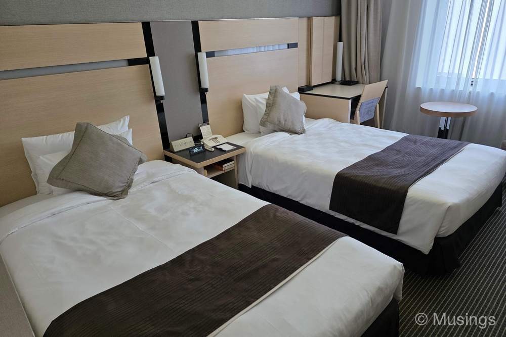 The room I stayed was a Twin Standard Room and located on the ninth floor. Size-wise, it was significantly larger at 30sqm compared to the small 14-15 sqm rooms in the station hotels I have routinely stay at in Fukuoka, Nagoya, and Tokyo. The room had space for a full-sized bathroom and toilet, with the bathroom separated from the toilet via door. The TV was disappointingly small though – not that there was anything interesting to watch in the broadcast channels that TV had installed.