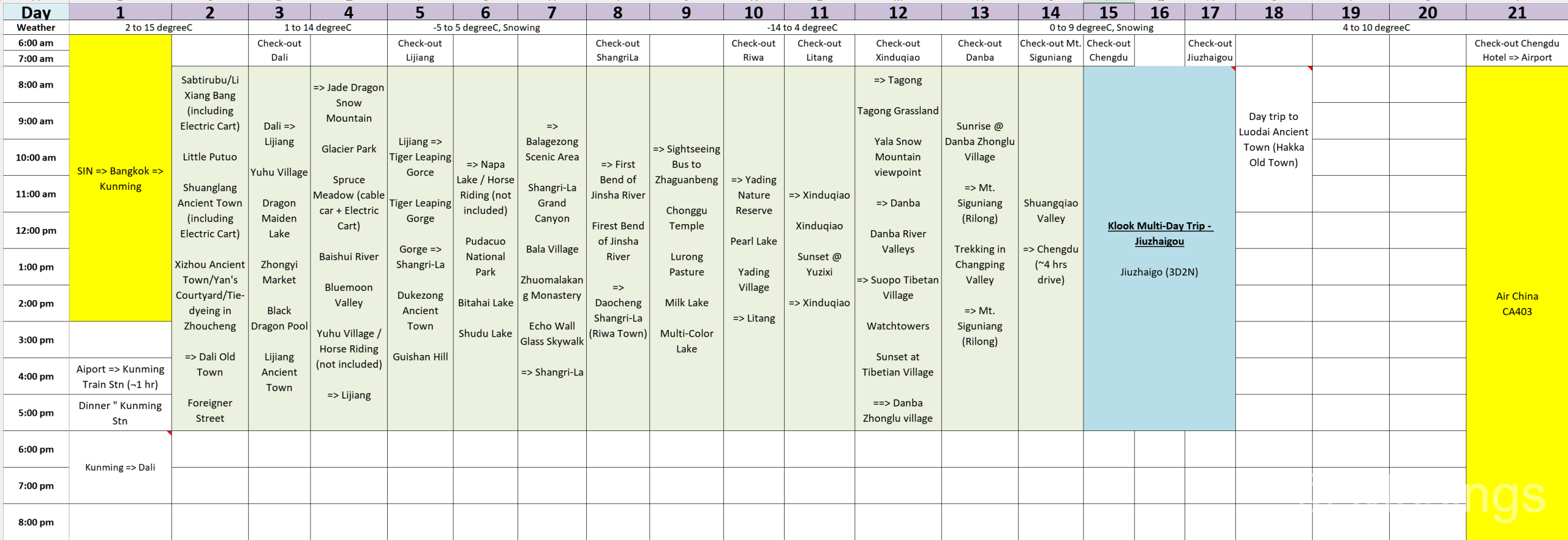 Our private tour begins on Day 02, and runs for 13 days till Day 14. We’d following the route I described in the earlier post: Dali => Lijiang => Shangri-La => Riwa => Litang => Xinduqiao => Danba => Siguniang, and we’ll return to Chengdu. Altitude sickness was a worry the wife has. But I reckon we should be fine, since with this route, we’re going from mid to gradually higher elevations. The weather and climate will also likely get progressively colder as we travel northwards, with expected lows of -14 degreeC in selected parts of Western Sichuan.