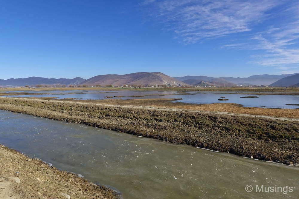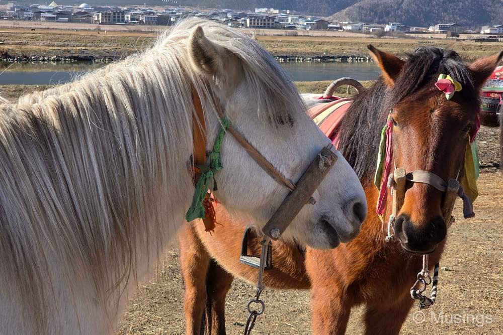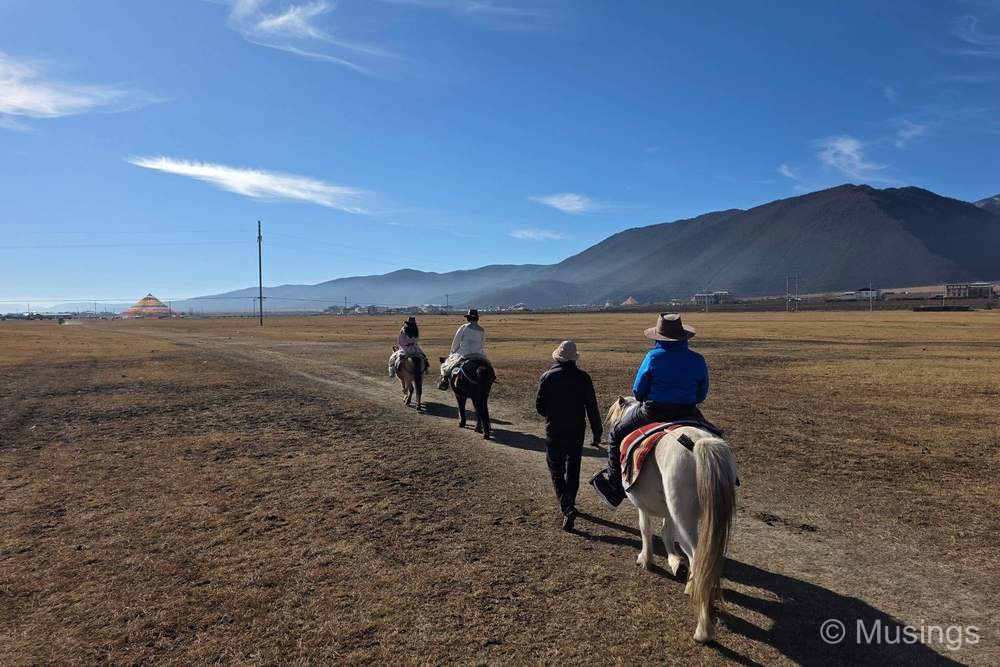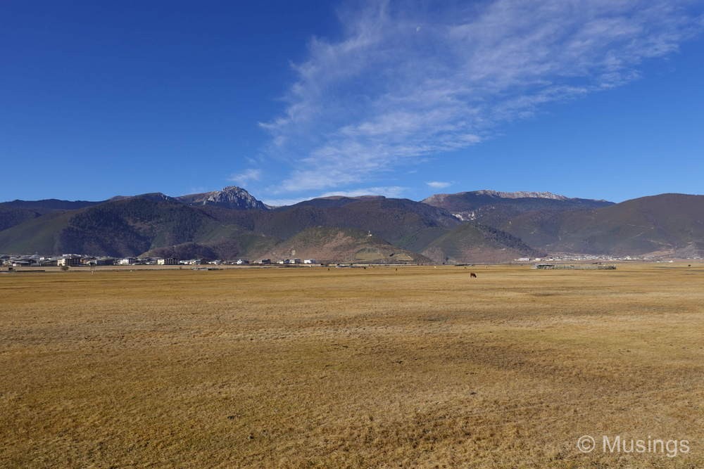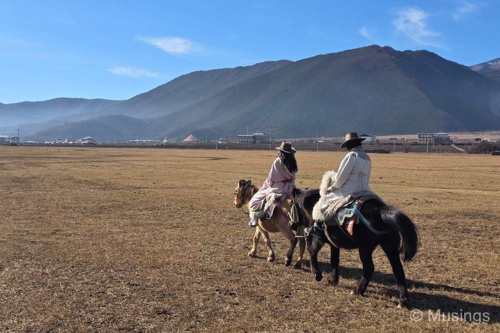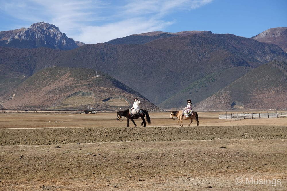 We had just two activities for Day 06 in Shangri-La county today: visiting Napa Lake (also known as Napahai Nature Reserve) in the morning, and Pudacuo National Park in the afternoon. The Napa Lake is a vast grassland with surronuding mountains. The grasslands though were mostly dried up in winter, and looked drab – I’ve no doubt that it looks much in spring and summer. But the most popular activity for tourists like us visiting Napa Lake is horseback riding. The costs of the horseback riding experience wasn’t included in our tour package and was left as an optional experience: but since we were here, we went for it. The price per person was 280 RMB for the classic route, but our guide bargained it down to 200 RMB. Guests in the experience also haev the option of dressing up in traditional Tibetan clothes, though only the girls in the family went for it. The boys – basically myself and Peter – opted to keep it simple and made do wtih cowboy hats.