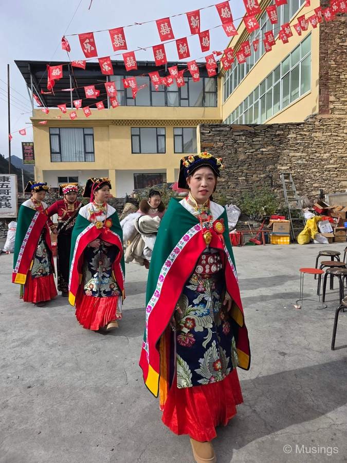 We’re finally coming to an end of the Western Sichuan segment of our trip. We said goodbye to Danba River Valley early morning and drove in an easterly direction the 112km to the Mt. Siguniang Scenic Area where we’d be spending Day 13 and also part of Day 14 tomorrow. The drive downhill from the Danba valley hilltops where our homestay was located was not particularly thrilling though with a very large number of sharp turns. Fortunately, we reached the ground level 15 minutes after we drove off: any longer and there was a good chance one of us would have felt nauseous! The rest of the drive was pleasant, and on the way to Mt. Siguniang, there was a local marriage procession on the road and we snapped some quick pictures, and also at a small village with an old castle and watchtower.