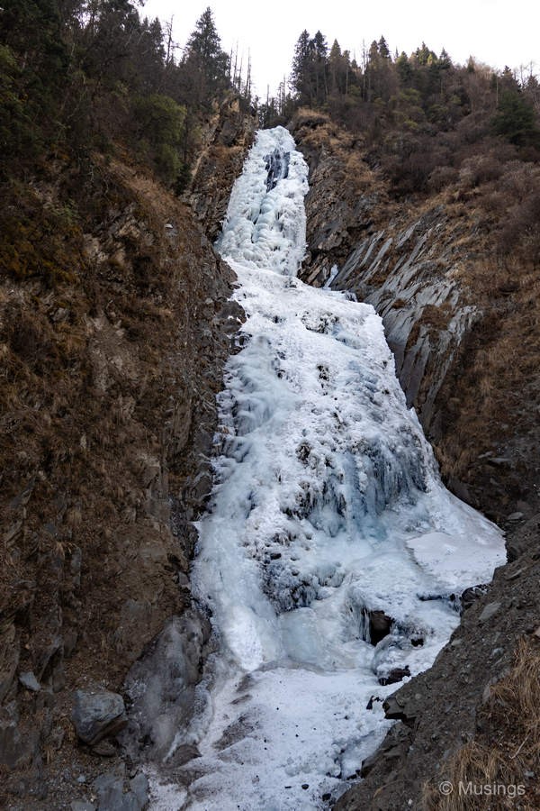 The aerial video here starts with a vertical look at this waterfall, then pulls back for a look at the valley, the snow-capped peaks of Mt. Siguniang, and finally tracing the partially frozen river below and also the boardwalk that follows it. At the last seconds is a passing shot of the waterfall viewing platform – the terminal point for us before we headed back. The sun was ducked well-behind cloud cover today, so the general scenery in the early to mid PM was a little gloomy.