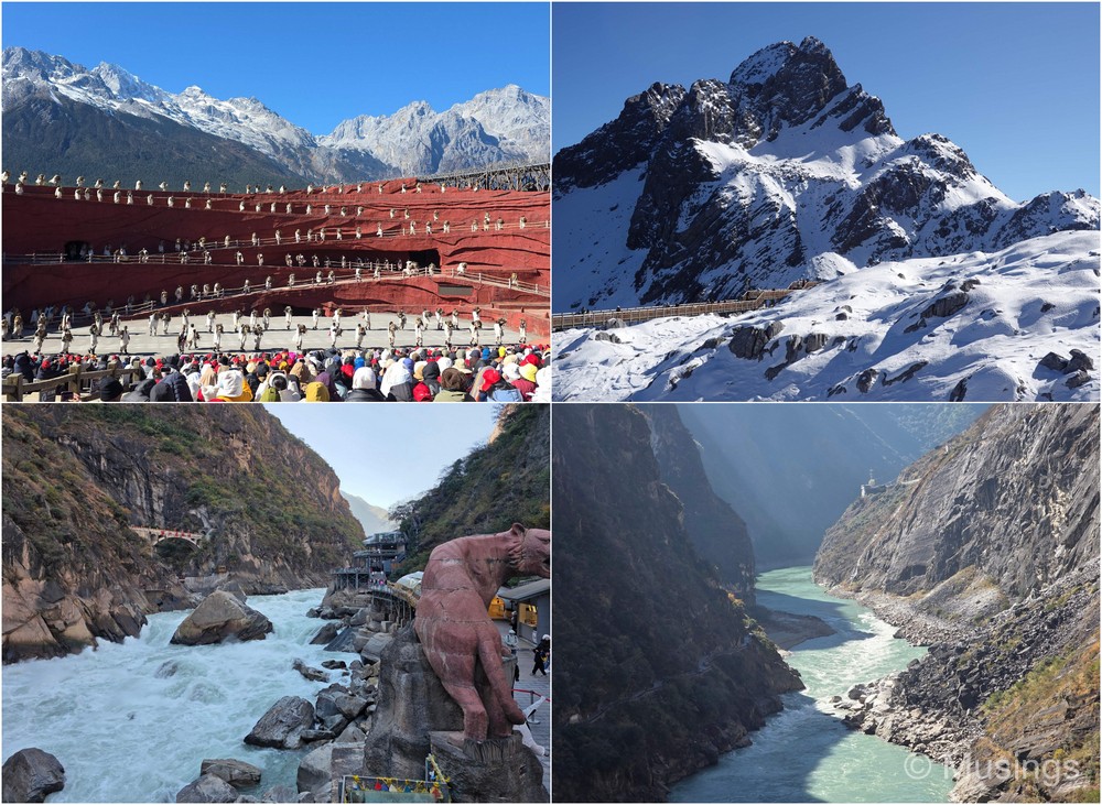 Tiger Leaping Gorge (~1 to 2 hrs) [blog post here]: rushing waters of Jingsha River here was quite a sight. The walk down-steps is easy. Pro-Tip #12: the temperature down below at the water level is much colder than up-top, so dress appropriately. The walk back up to the car park takes a bit more effort, but is finally doable: it took us around 20 minutes to walk back up, slowly. You can also pay the exhorbitant fee to ride the escalators back up if you want, but IMO, the price of the escalator ride is not worth it.