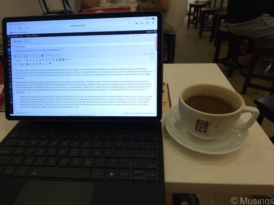 This 21 day family vacation to Yunnan and Western Sichuan has been the longest we’ve had. We initially thought we’d be able to handle that long a stretch without breaking a sweat. As it turned out, by the time we’d returned from Western Sichuan to Chengdu on Day 14, we were pretty much worn out and lethargy was seeping in! So much so that – in a sense – we opted to take things slow, did not really try very hard to pack in as many sights and places to visit anymore, and half-just waited our flight back home.